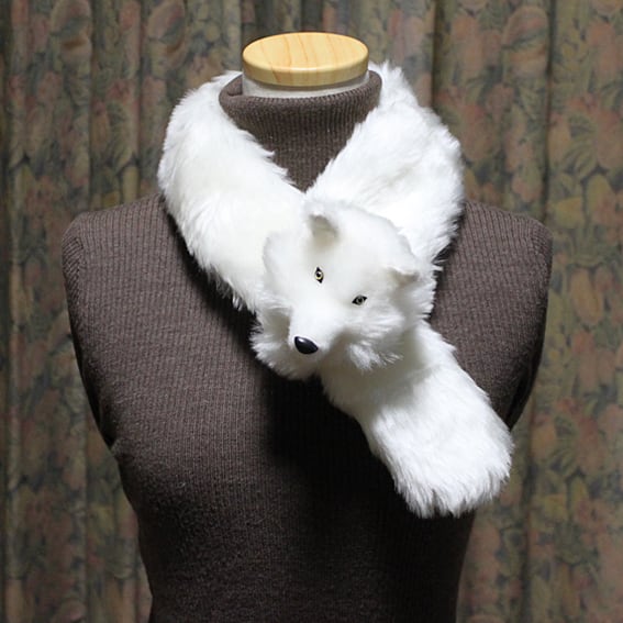ホッキョクオオカミを象った真っ白なマフラーです。裏側にループが付いていて留められるようになっています。冬のお出かけに、首元を温かく包んでくれます。